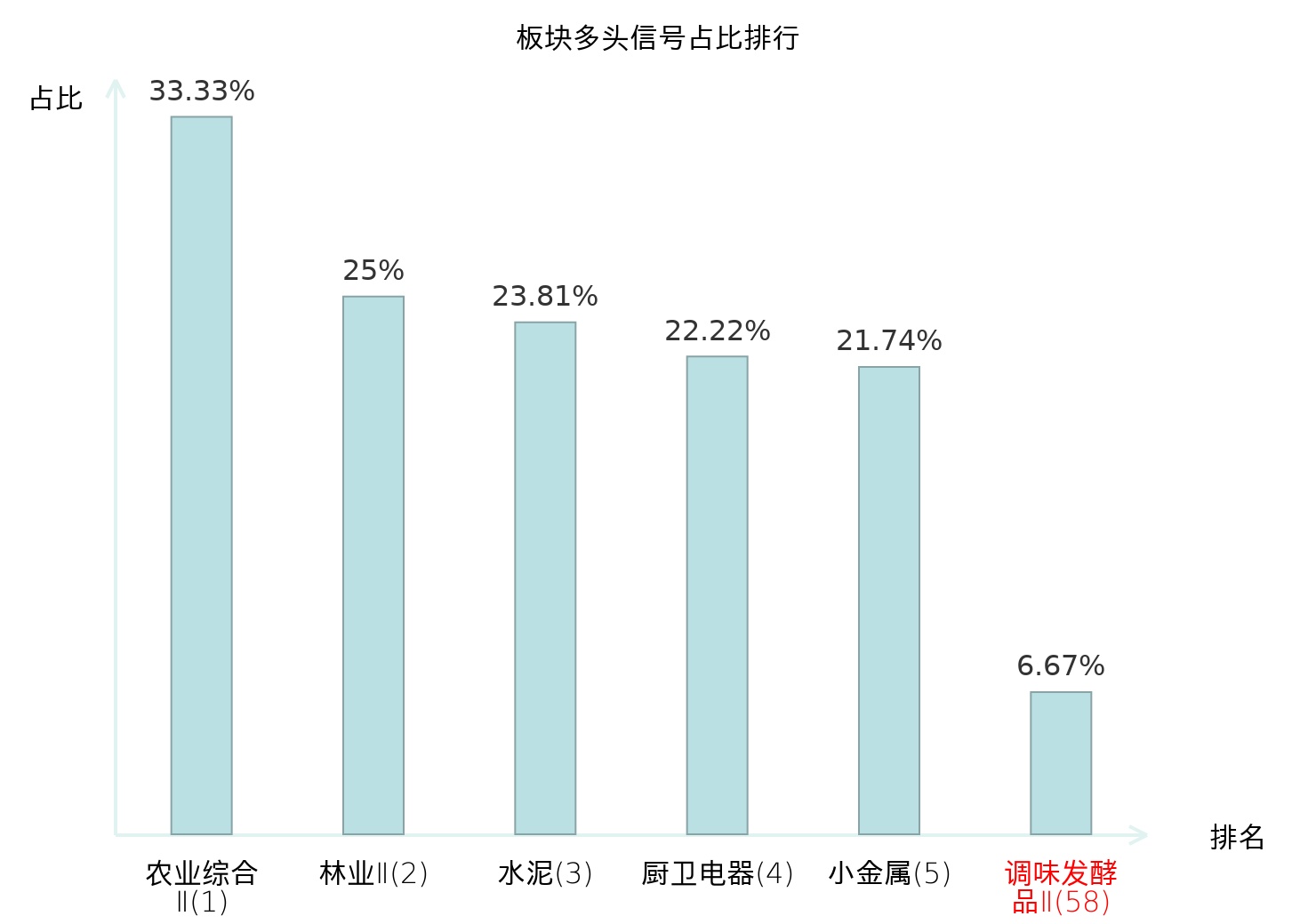 全市场所有行业板块中主力多头信号占比排名中,农业综合Ⅱ板块位居第一。农业综合Ⅱ板块名次提升最快,较昨日上升127位。