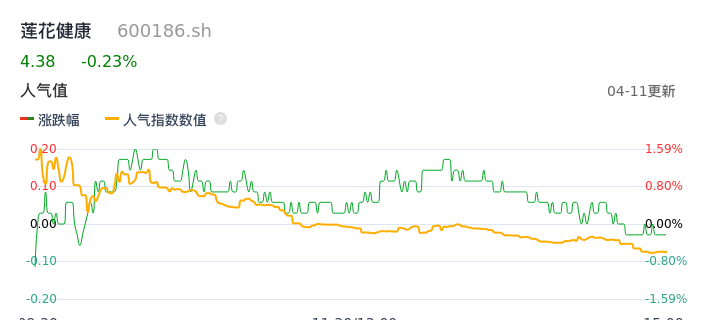 04月11日,莲花健康收报4.38,股价涨幅-0.23%,成交金额1.81亿元,换手率2.29%。