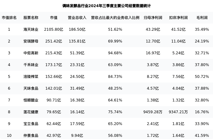 莲花健康最新报告期数据为三季度,下表汇总了调味发酵品行业内市值靠前的公司三季度主要经营数据