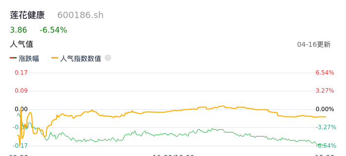 04月16日,莲花健康收报3.86,股价涨幅-6.54%,成交金额2.66亿元,换手率3.77%。