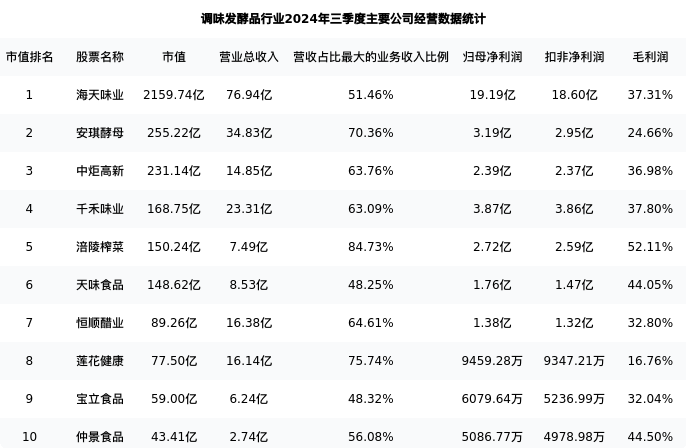 莲花健康最新报告期数据为三季度,下表汇总了调味发酵品行业内市值靠前的公司三季度主要经营数据