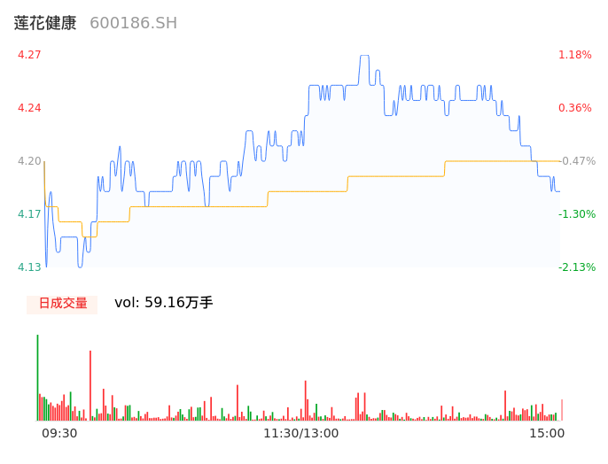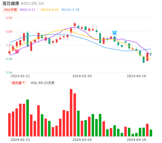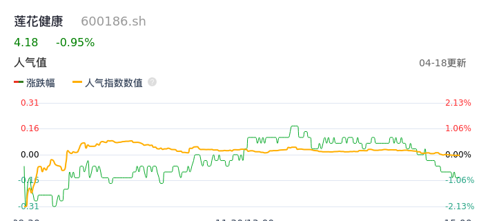 04月18日,莲花健康收报4.18,股价涨幅-0.95%,成交金额2.49亿元,换手率3.32%。
