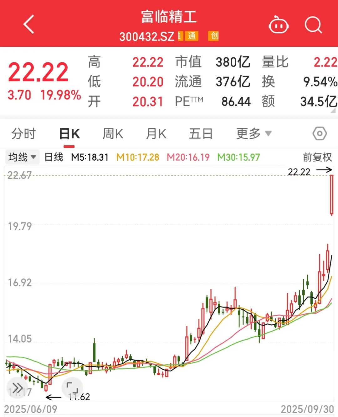 今日(9月30日)早盘,富临精工(300432)大幅高开,约9:45封住涨停板,涨停板封单一度超过34万手。目前该股最新价已创2022年以来新高,A股市值逼近380亿元。