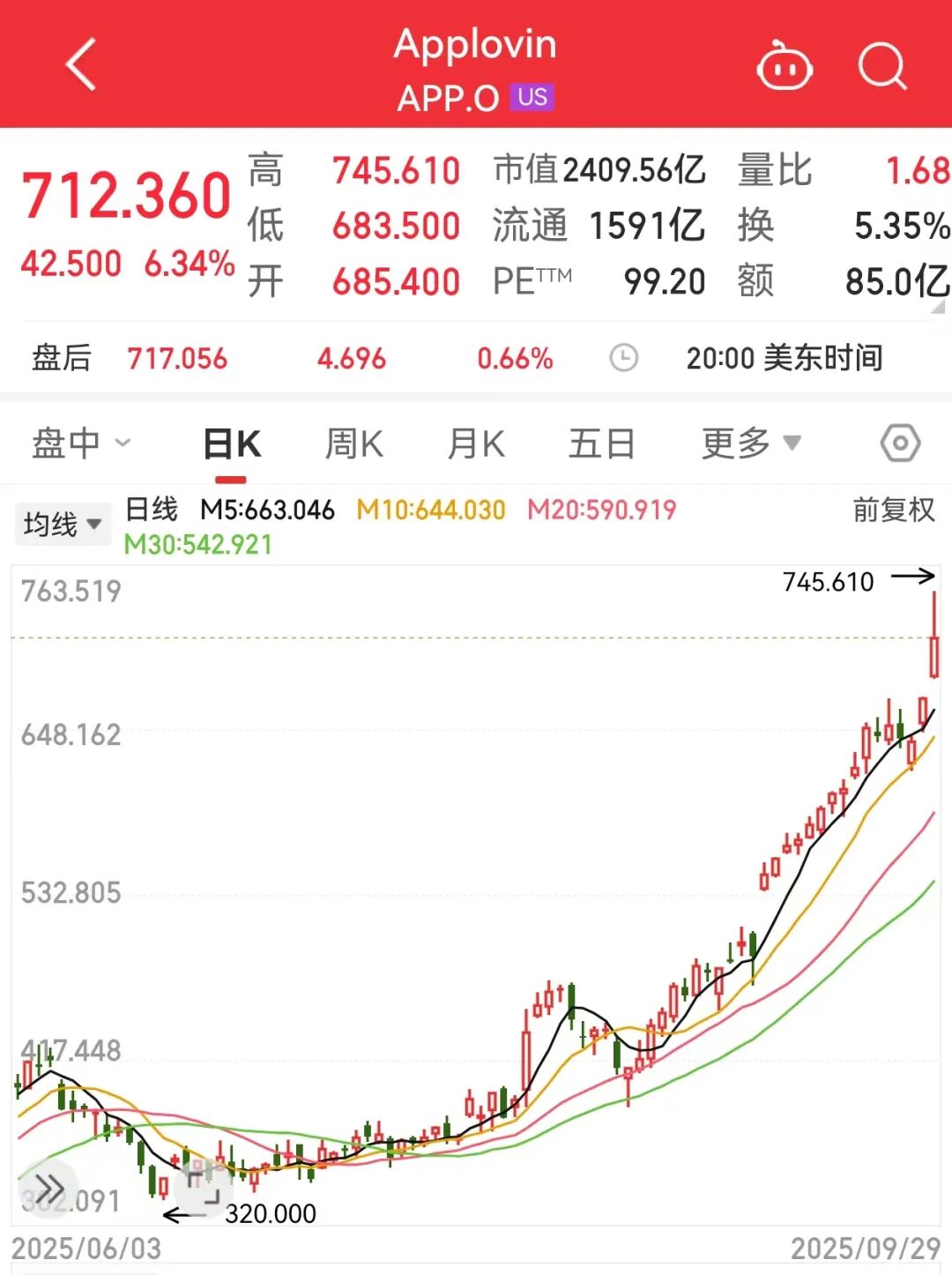 美国当地时间9月29日,美股人工智能(AI)应用的龙头公司AppLovin股价大涨6.34%,最新收盘价712.36美元/股,创历史新高。今年以来,该股累计上涨119.98%,最新总市值飙升至2409.56亿美元(折合人民币约1.71万亿元)。