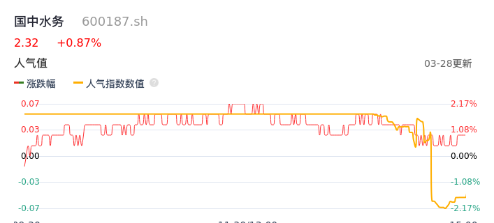 03月28日,国中水务收报2.32,股价涨幅0.87%,成交金额3503.78万元,换手率0.93%。