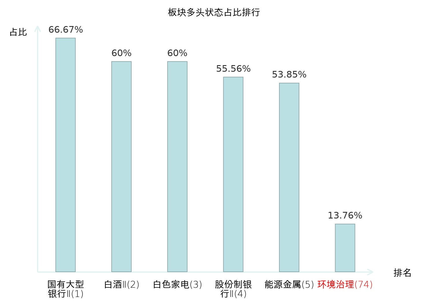 全市场所有行业板块中主力多头状态占比排名中,国有大型银行Ⅱ板块位居第一。电子化学品Ⅱ板块名次提升最快,较昨日上升55位。