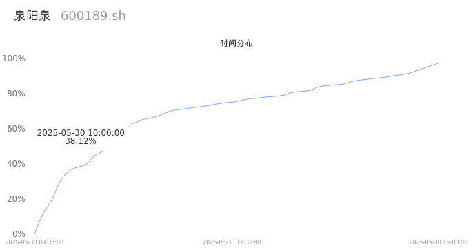 600189泉阳泉2025年05月30日成交57.90万手,成交金额4.66亿,相较昨日放量6.05万手,换手率8.10%,成交清淡。