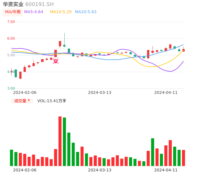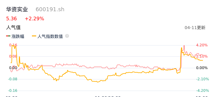 04月11日,华资实业收报5.36,股价涨幅2.29%,成交金额7136.59万元,换手率2.77%。