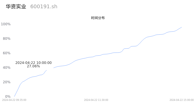 首先我们来看当日成交的时间分布。将今日交易时间按照5分钟的时间间隔进行切片,并绘制分布直方图进行观察。可以发现,10点之前的成交量占全天成交量的27.06%,这说明,该股票活跃时段换手率一般,资金热度较一般。