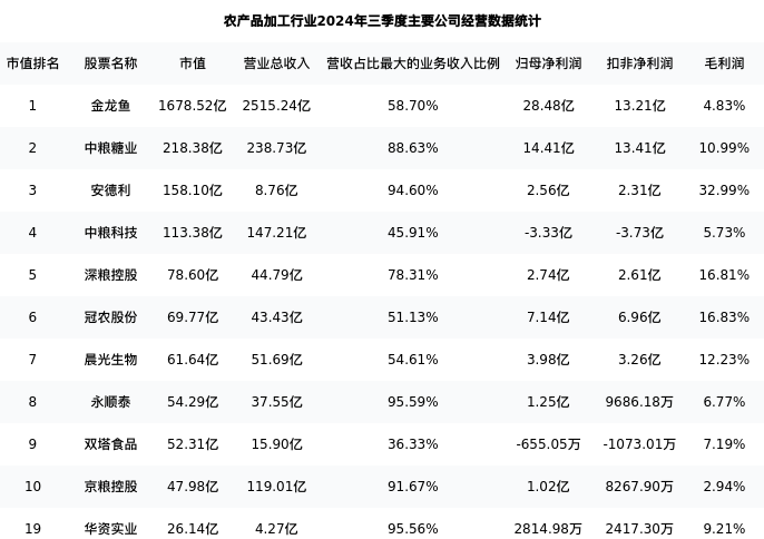 华资实业最新报告期数据为三季度,下表汇总了农产品加工行业内市值靠前的公司三季度主要经营数据