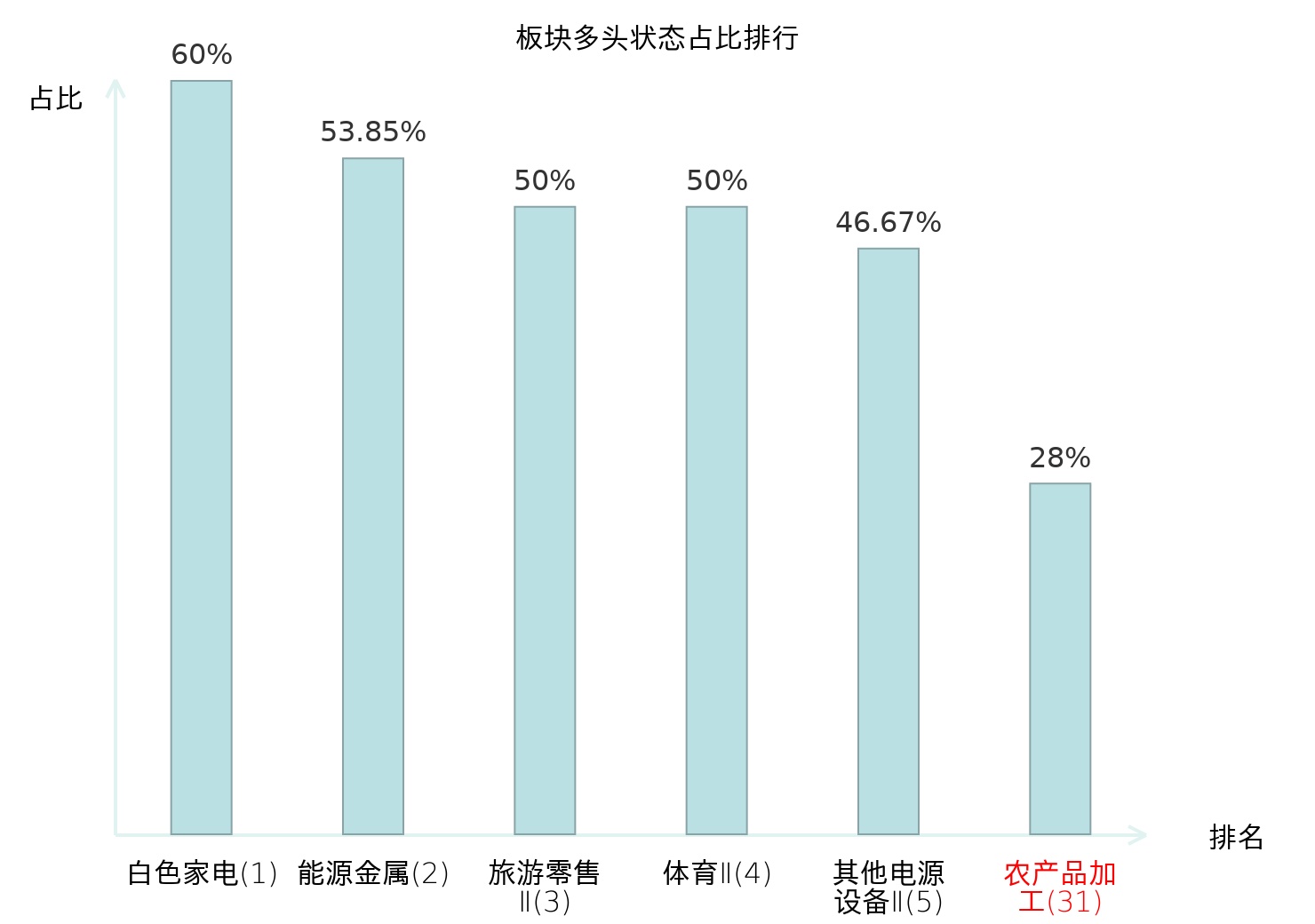 全市场所有行业板块中主力多头状态占比排名中,白色家电板块位居第一。体育Ⅱ板块名次提升最快,较昨日上升127位。