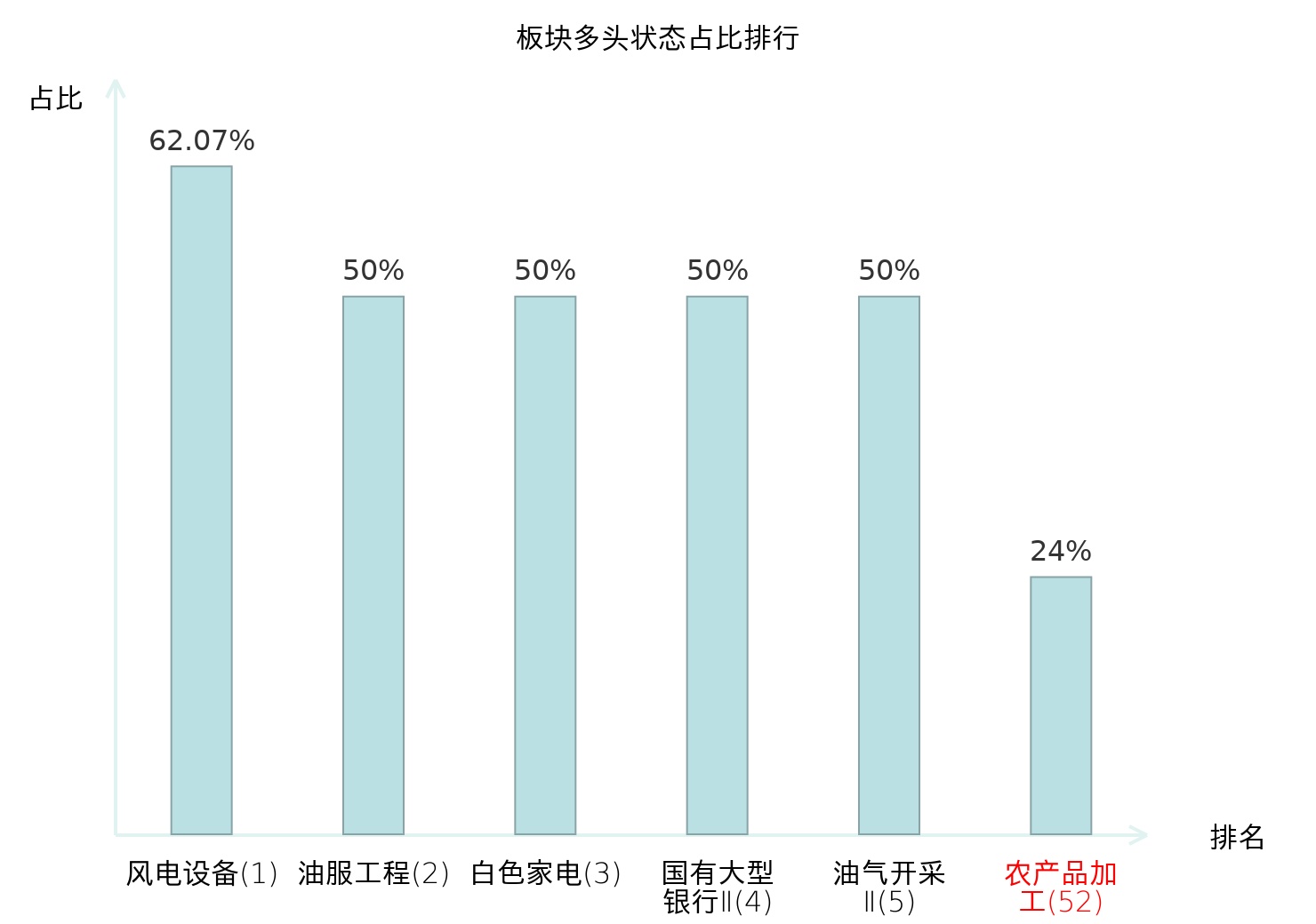 全市场所有行业板块中主力多头状态占比排名中,风电设备板块位居第一。动物保健Ⅱ板块名次提升最快,较昨日上升64位。