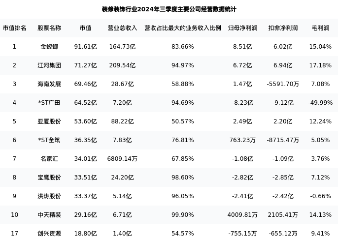 创兴资源最新报告期数据为三季度,下表汇总了装修装饰行业内市值靠前的公司三季度主要经营数据