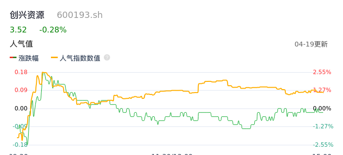 04月19日,创兴资源收报3.52,股价涨幅-0.28%,成交金额1577.70万元,换手率1.05%。