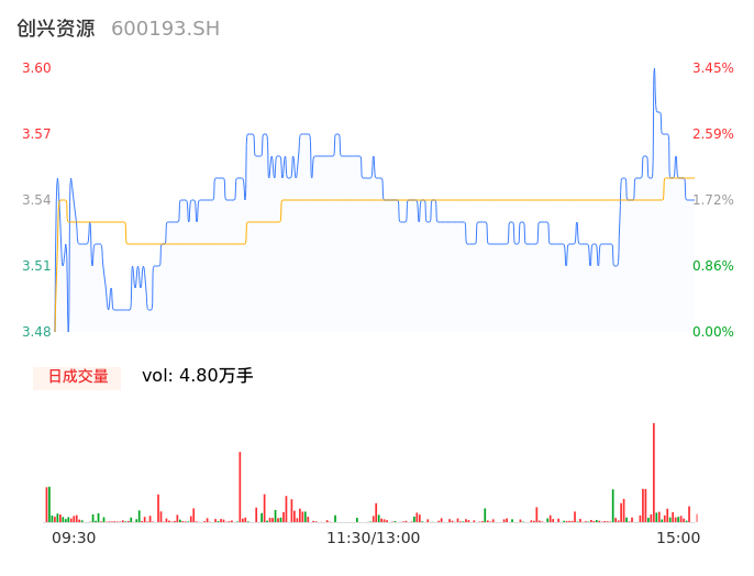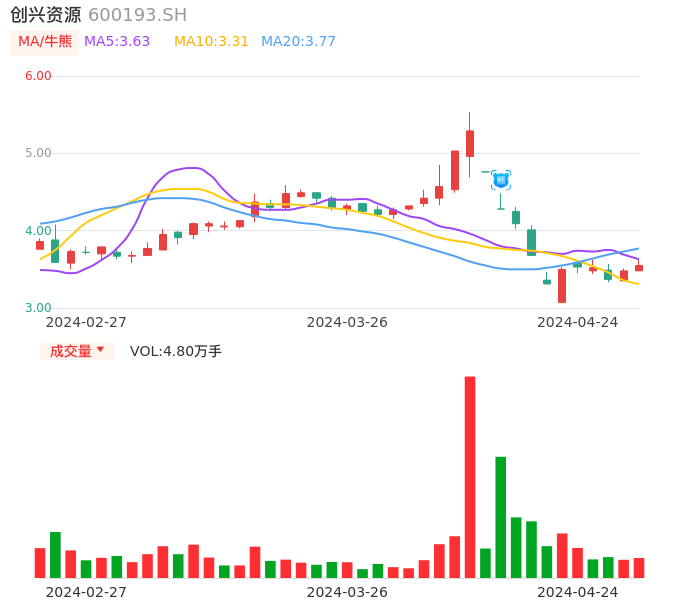 04月24日,创兴资源收报3.55,股价涨幅2.01%,成交金额1702.28万元,换手率1.13%。
