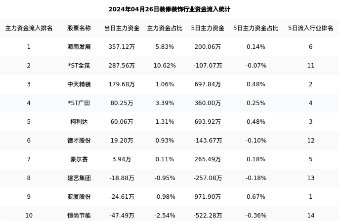从主力资金流向来看,装修装饰行业今日主力资金流入2.10亿元,在所有申万二级行业中排名:20/131。