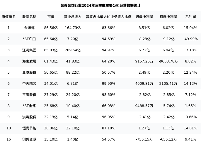 创兴资源最新报告期数据为三季度,下表汇总了装修装饰行业内市值靠前的公司三季度主要经营数据