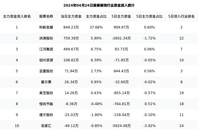 从主力资金流向来看,装修装饰行业今日主力资金流入2.29亿元,在所有申万二级行业中排名:47/131。