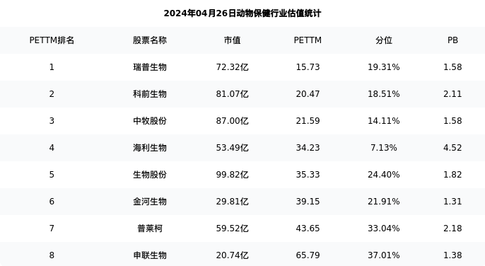 从估值角度看:中牧股份最新市盈率PETTM为21.59,在行业内排名3/10,处于14.11分位。