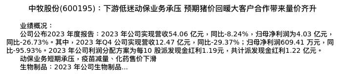 值得注意的是:2024年04月国投证券的冯永坤分析师,首次发布关于中牧股份的研究报告,标题为:中牧股份(600195):下游低迷动保业务承压 预期猪价回暖大客户合作带来量价齐升。
