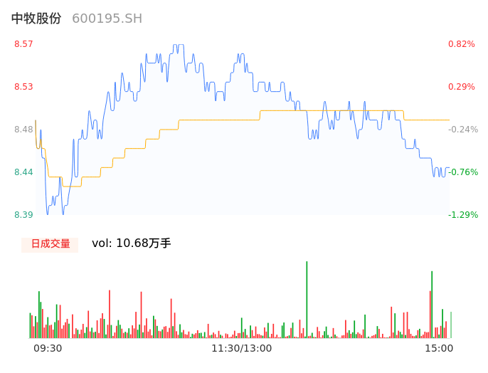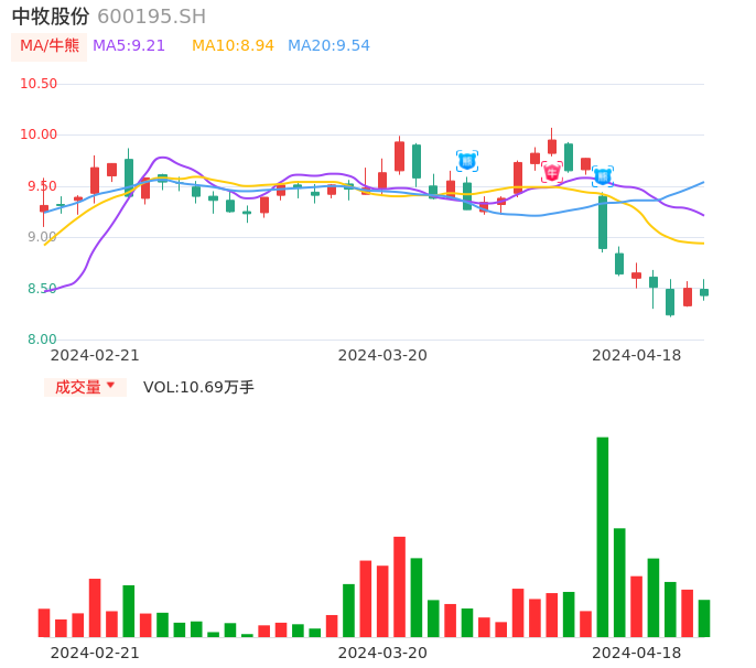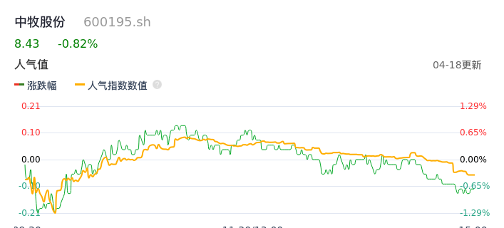 04月18日,中牧股份收报8.43,股价涨幅-0.82%,成交金额9068.62万元,换手率1.05%。