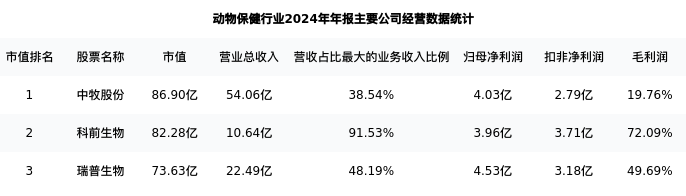 中牧股份最新报告期数据为年报,下表汇总了动物保健行业内市值靠前的公司年报主要经营数据