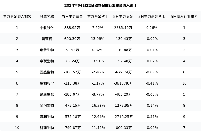 中牧股份今日净流入888.93万元,主力占比7.22%,在行业内排名:1/10;5日净流入2285.40万元,主力占比0.26%,在行业内排名:1/10。