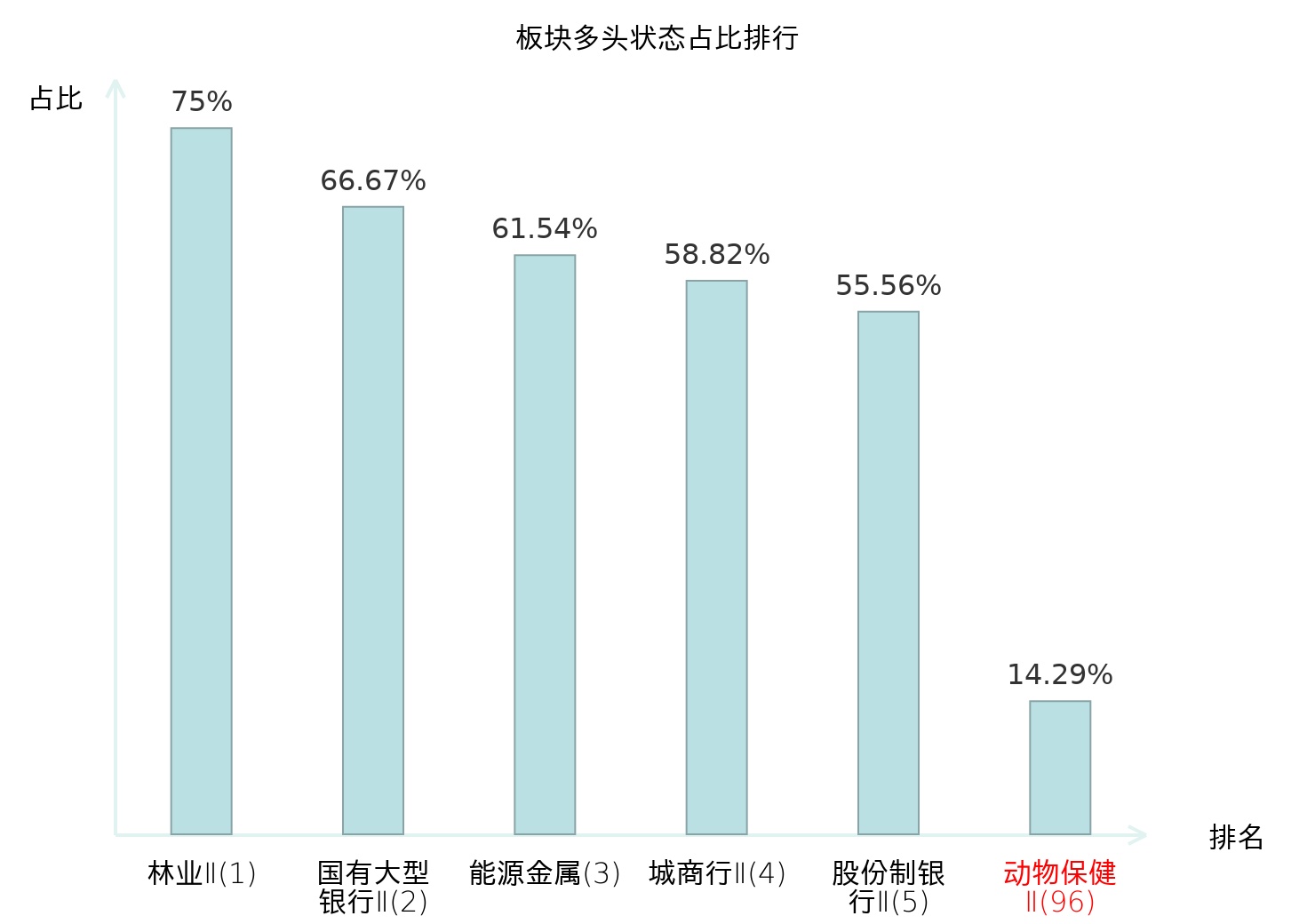 全市场所有行业板块中主力多头状态占比排名中,林业Ⅱ板块位居第一。专业连锁Ⅱ板块名次提升最快,较昨日上升63位。