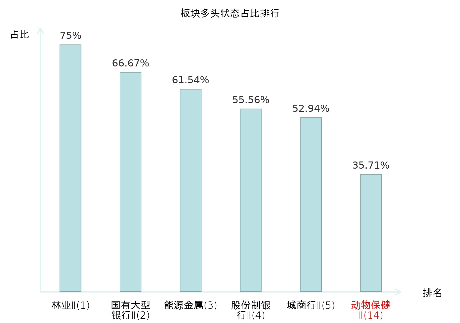 全市场所有行业板块中主力多头状态占比排名中,林业Ⅱ板块位居第一。动物保健Ⅱ板块名次提升最快,较昨日上升82位。
