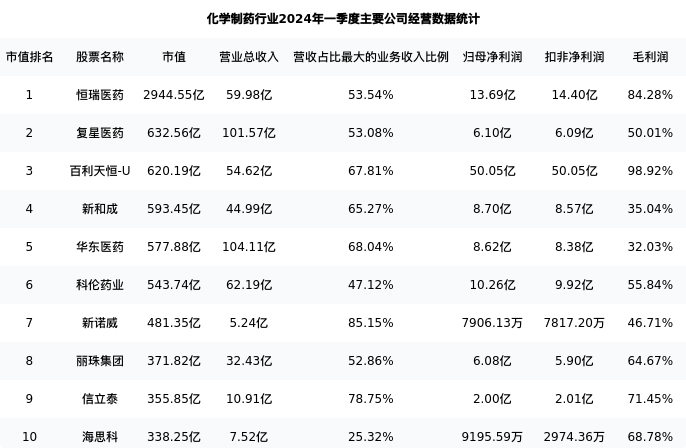 复星医药最新报告期数据为一季度,下表汇总了化学制药行业内市值靠前的公司一季度主要经营数据