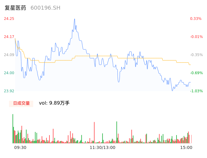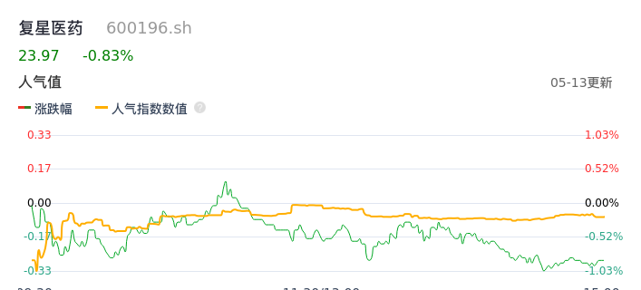 05月13日,复星医药收报23.97,股价涨幅-0.83%,成交金额2.38亿元,换手率0.47%。
