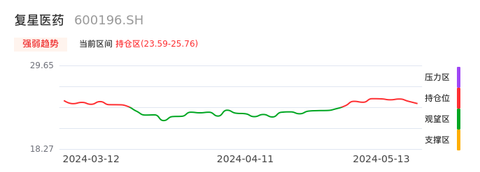 我们来看一下该股的九方特色指标强弱趋势的情况:复星医药自04月26日从观望区上穿到持仓区。股价近期在多头区域回调整理。后续重点关注多空分界点的争夺:23.59元。如未能有效站稳则可能重新回到空头行情。