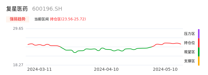 我们来看一下该股的九方特色指标强弱趋势的情况:复星医药自04月26日从观望区上穿到持仓区。股价近期在多头区域回调整理。后续重点关注多空分界点的争夺:23.56元。如未能有效站稳则可能重新回到空头行情。