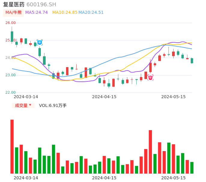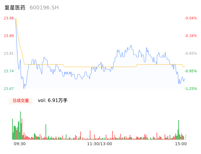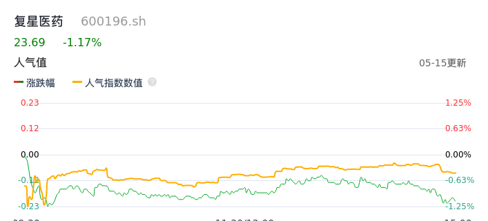 05月15日,复星医药收报23.69,股价涨幅-1.17%,成交金额1.64亿元,换手率0.33%。