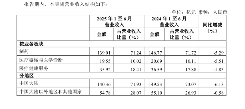 具体到业务层面,目前复星医药主营业务可以拆分为四大板块,其中制药占比最大,2025年上半年实现营收实现139亿元,占公司营收的比重超过了70%。其余包括医疗器械与医学诊断、医疗健康服务,以及部分医药分销及零售业务。