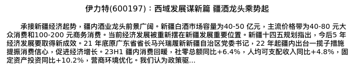 值得注意的是:2024年04月海通证券的颜慧菁分析师,首次发布关于伊力特的研究报告,标题为:伊力特(600197):西域发展谋新篇 疆酒龙头乘势起。