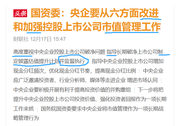 今晚还有一个大新闻,国务院国资委印发《关于改进和加强中央企业控股上市公司市值管理工作的若干意见》。经常炒股的应该了解,政策文件一旦出现《关于*****的***若干意见》,它的意义非常重大,因为它不是“研究”、也不是“规划”,而是将要落地实施的国家级战略部署。至于对A股中字头/央国企的影响,利好是肯定的,但建议大家用中长线看待,不要用炒短线的思维看待这个事。