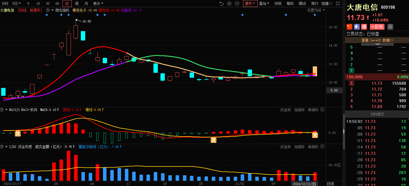 3)参考技术指标:大唐电信-微龙指标-出现启动K线信号