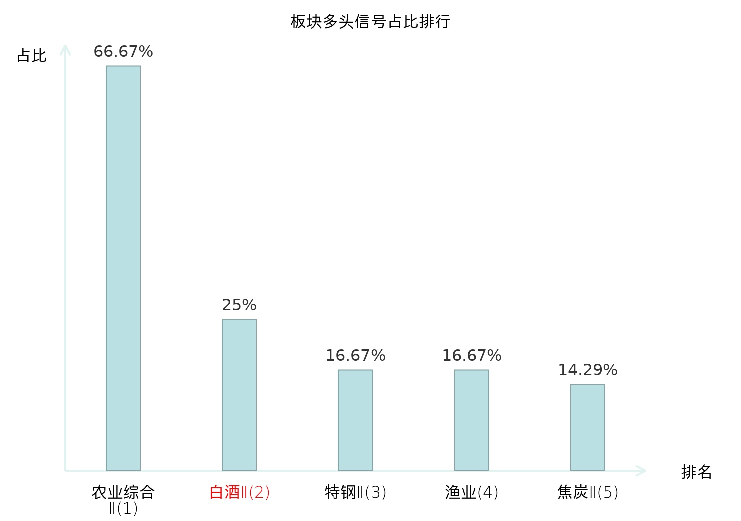 全市场所有行业板块中主力多头信号占比排名中,农业综合Ⅱ板块位居第一。农业综合Ⅱ板块名次提升最快,较昨日上升127位。