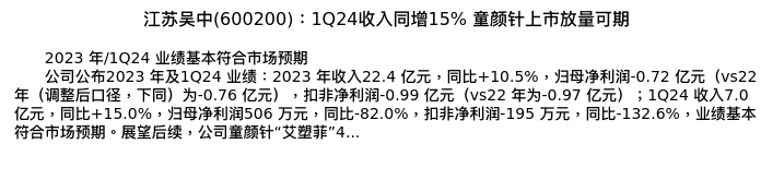 值得注意的是:2024年04月中金公司的徐卓楠分析师,首次发布关于江苏吴中的研究报告,标题为:江苏吴中(600200):1Q24收入同增15% 童颜针上市放量可期。