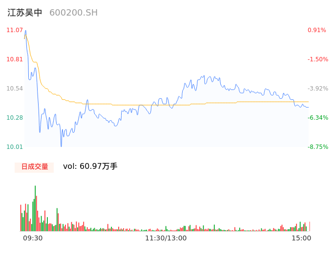 04月16日,江苏吴中收报10.37,股价涨幅-5.47%,成交金额6.35亿元,换手率8.59%。
