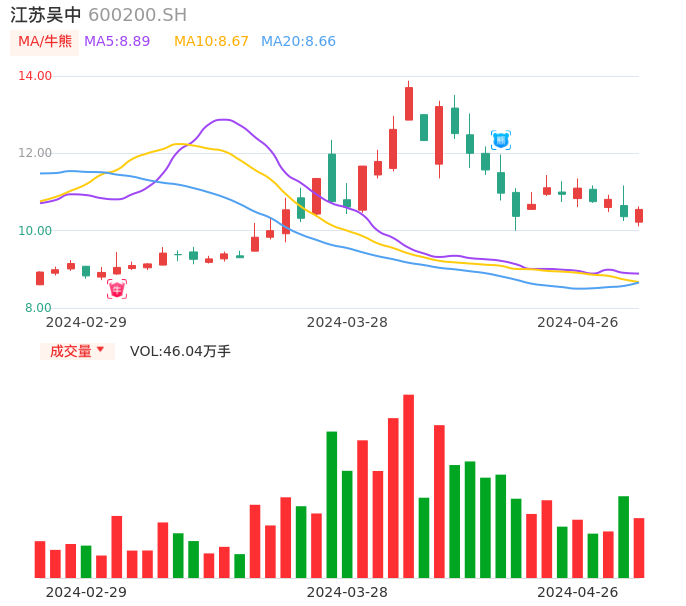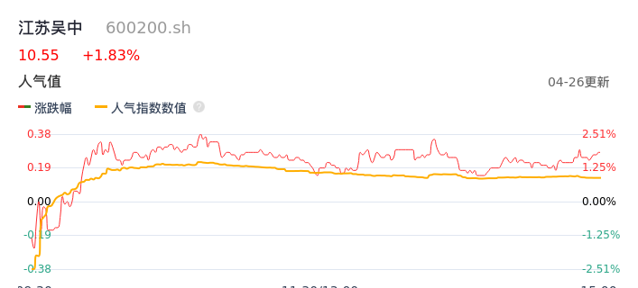04月26日,江苏吴中收报10.55,股价涨幅1.83%,成交金额4.82亿元,换手率6.49%。