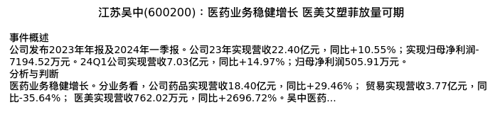 值得注意的是:2024年04月上海证券的梁瑞分析师,首次发布关于江苏吴中的研究报告,标题为:江苏吴中(600200):医药业务稳健增长 医美艾塑菲放量可期。