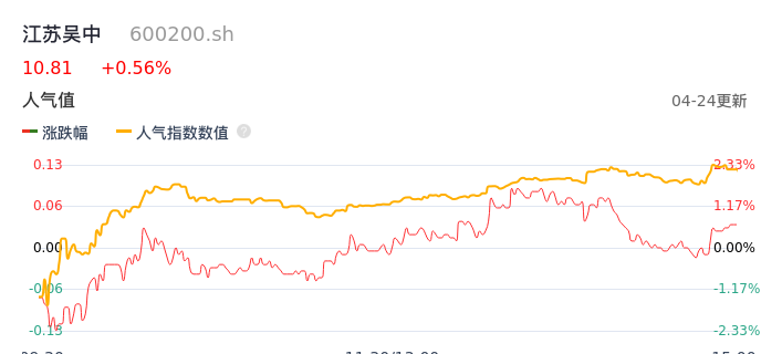 04月24日,江苏吴中收报10.81,股价涨幅0.56%,成交金额3.84亿元,换手率5.05%。