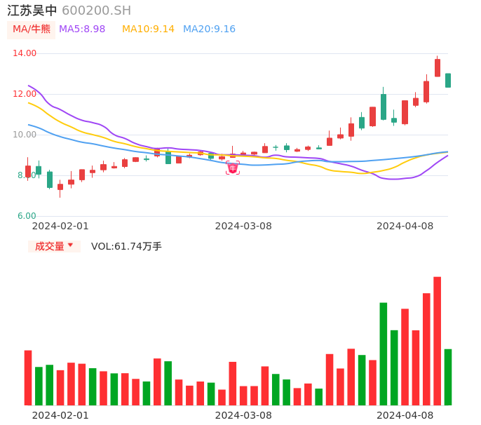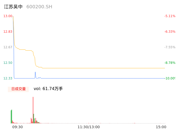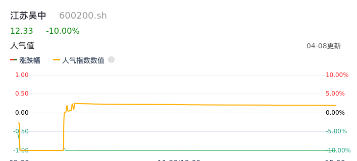 04月08日,江苏吴中收报12.33,股价涨幅-10.00%,成交金额7.68亿元,换手率8.70%。