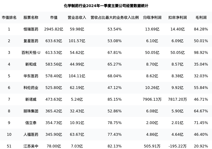 江苏吴中最新报告期数据为一季度,下表汇总了化学制药行业内市值靠前的公司一季度主要经营数据