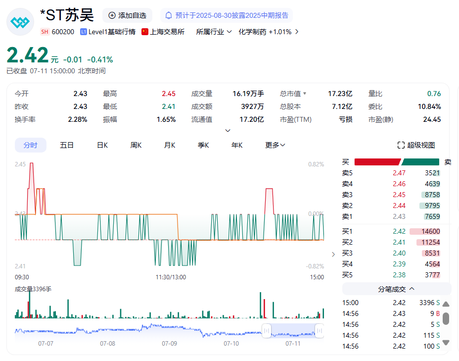 截至7月11日,*ST苏吴股价报2.42元/股,总市值17.23亿元。截至2025年3月31日,公司股东达到8.6万户。