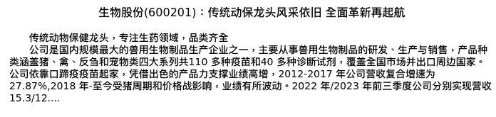 值得注意的是:2024年03月国投证券的冯永坤分析师,首次发布关于生物股份的研究报告,标题为:生物股份(600201):传统动保龙头风采依旧 全面革新再起航。