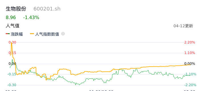 04月12日,生物股份收报8.96,股价涨幅-1.43%,成交金额9851.81万元,换手率0.98%。