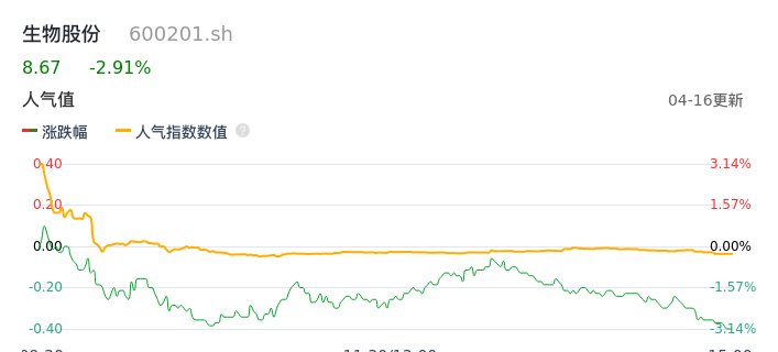 04月16日,生物股份收报8.67,股价涨幅-2.91%,成交金额1.31亿元,换手率1.33%。